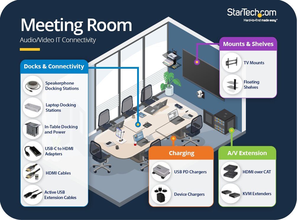 Als Ihr Partner für IT-Infrastruktur setzen wir bei SoftExpress auf die bewährten Connectivity-Lösungen von StarTech.com. Hier sind die 6 Bausteine, die wir für ein reibungsloses Meeting-Erlebnis empfehlen: